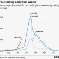 این تصویر وضعیت موارد ابتلا به آنفلوآنزا در بریتانیا را نشان میدهد. همانطور که مشاهده میکنید، امسال شروع فصل آنفلوآنزا زودتر از سالهای قبلی است (خط قرمز). محققان معتقدند که این موضوع به خاطر جهشهای جدید سویهی H3N2 است. هفت جهش در این سویه شناسایی شده و حالا موارد ابتلا، سریعتر از حد انتظار افزایش […]